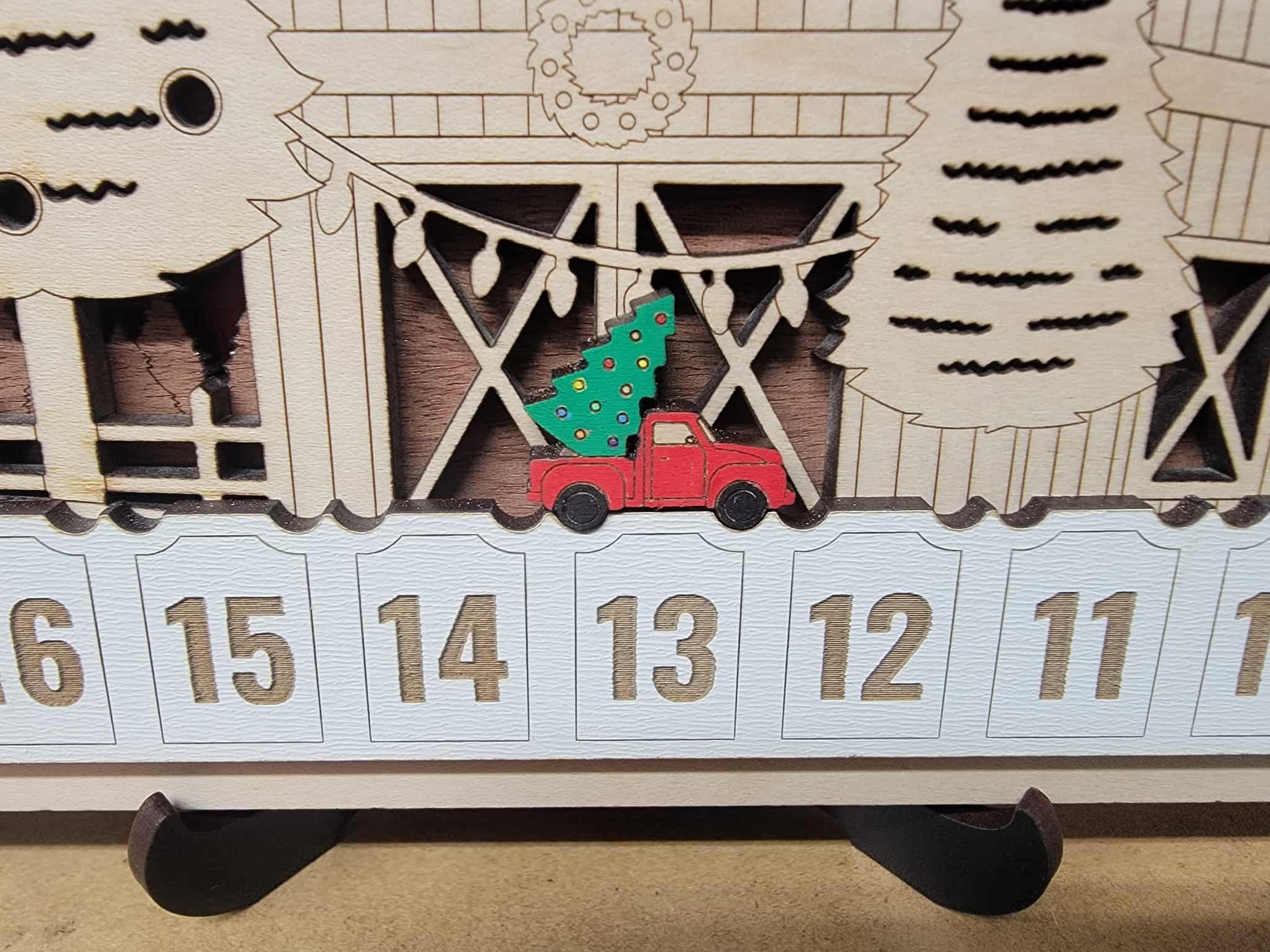 Count down the days until Christmas with our Tree Farm Christmas Countdown! Crafted from painted and unfinished maple and sapele wood, this rustic and nostalgic family tradition decoration features a hand painted red truck icon. Stand and two truck icons included. Keep the holiday spirit alive with this charming addition to your home.